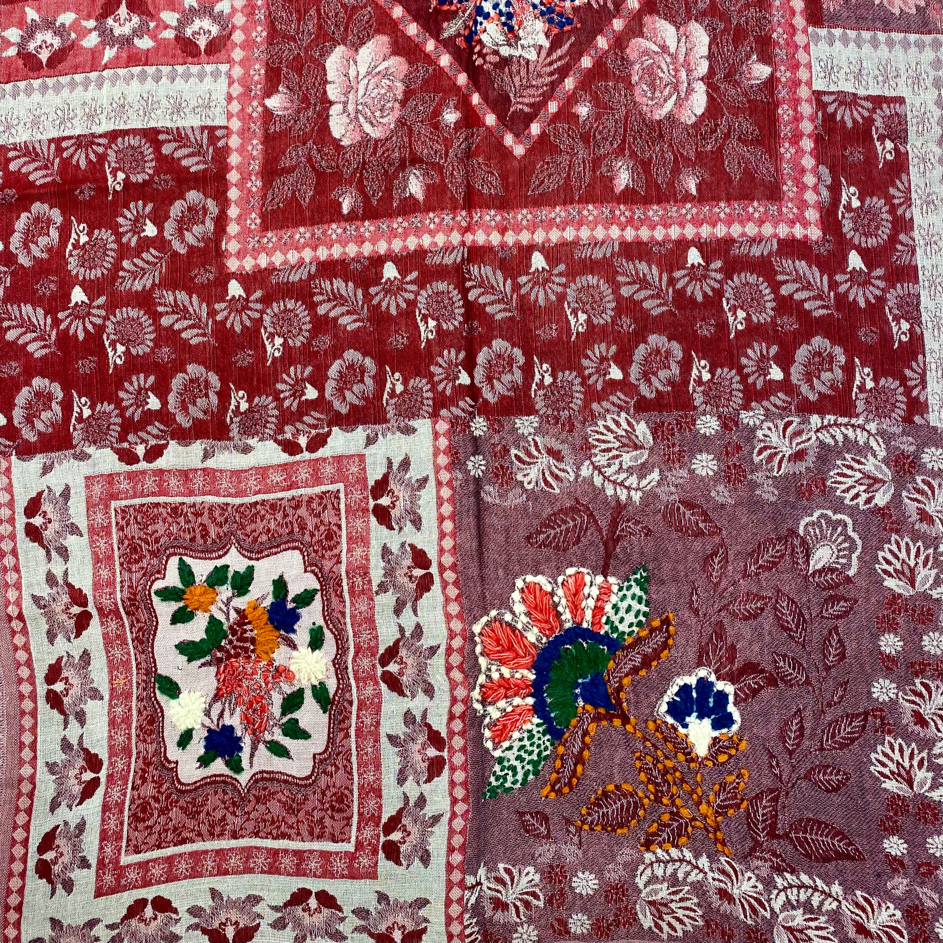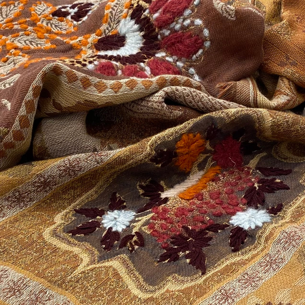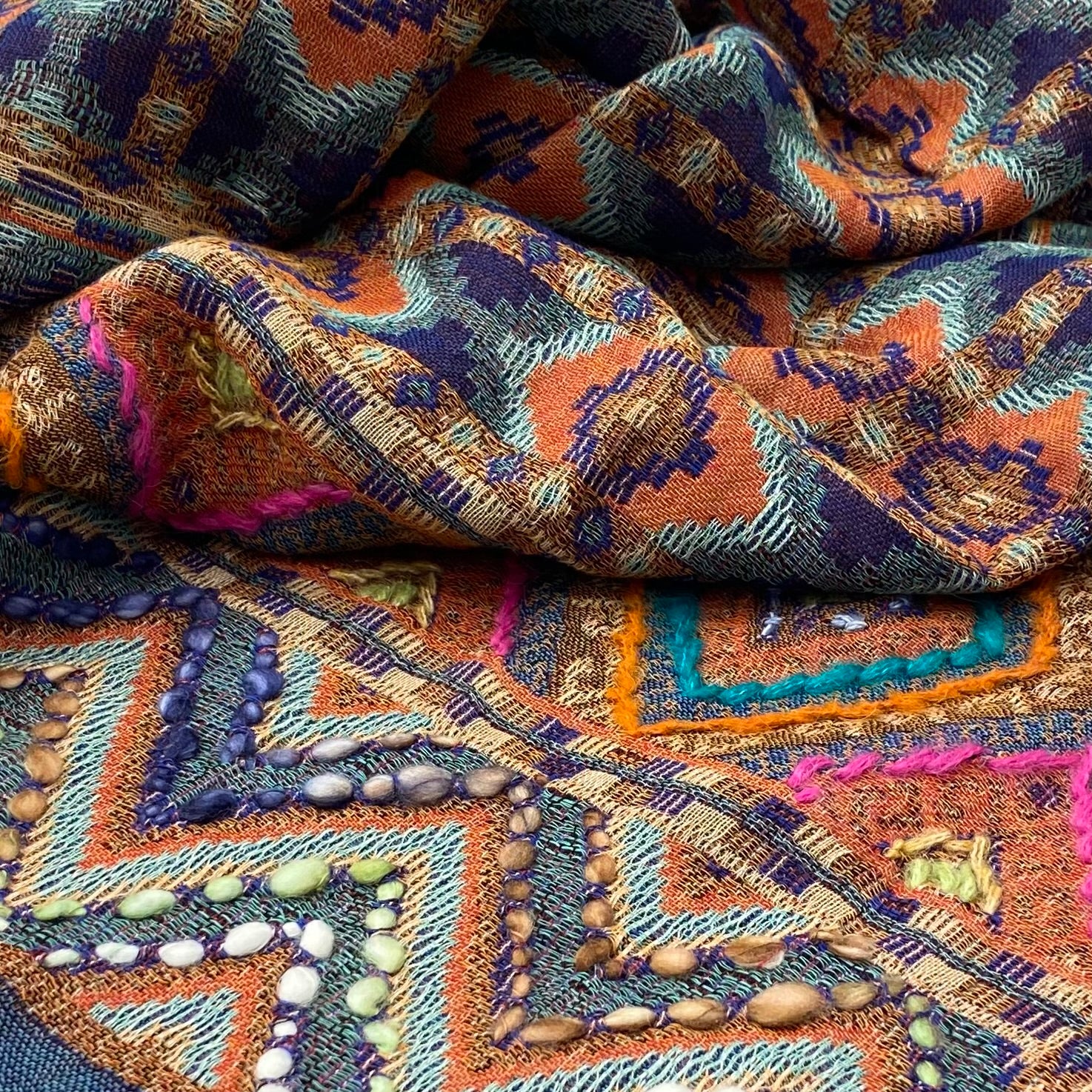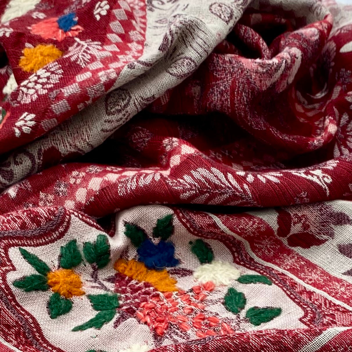 Crafted from a refined blend of cotton and wool, this embroidered shawl combines lightness, warmth, and subtle elegance. Each piece features delicate embroidery that adds quiet texture and artisanal charm without overpowering its timeless simplicity. Soft to the touch and beautifully draped, it’s a versatile accessory designed for effortless sophistication in any season.
