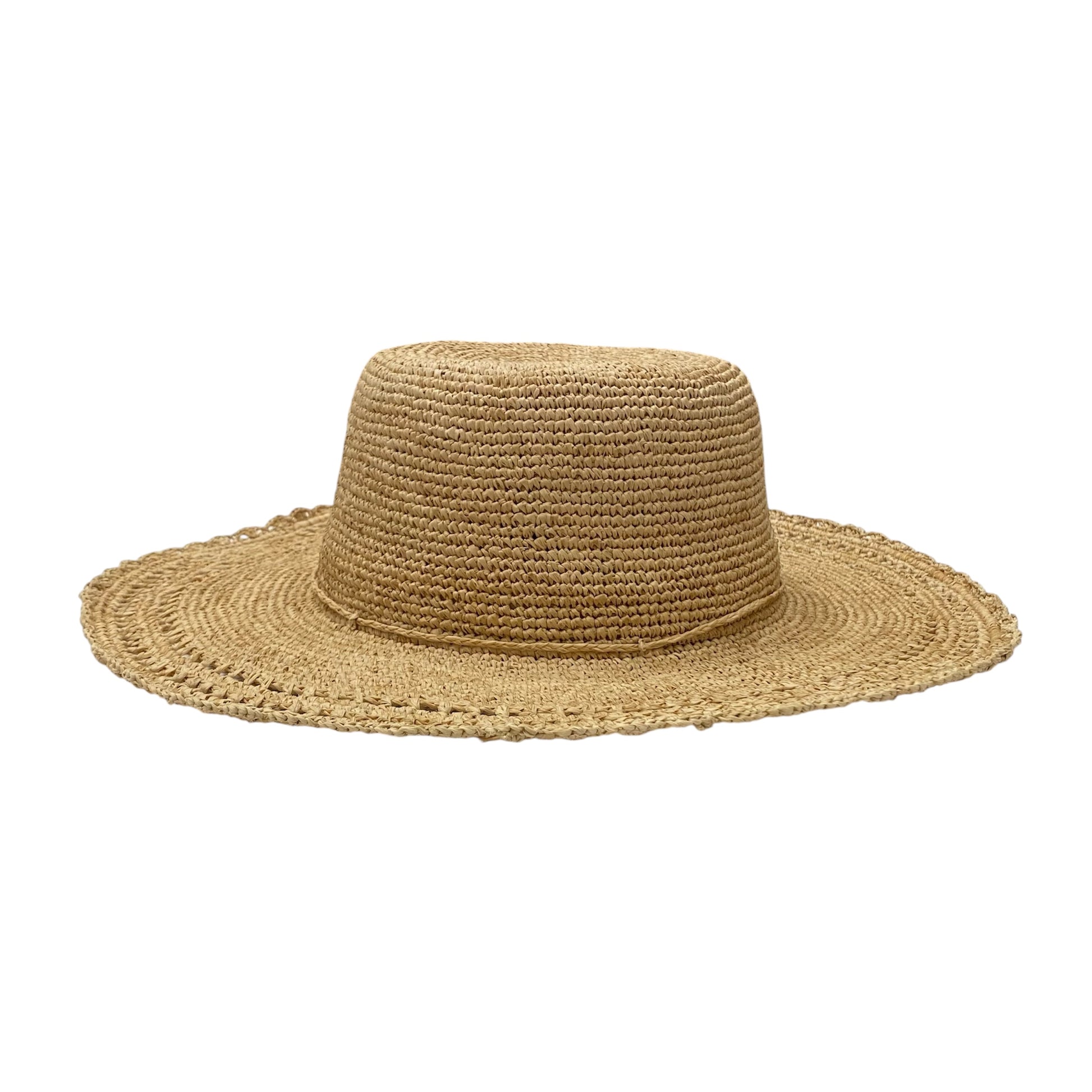 This delicate straw hat is the perfect choice for those seeking style and freshness on sunny days. Its feminine design features a rounded crown, a wide brim with an openwork edge, and a thin decorative bow that adds a romantic, natural touch.