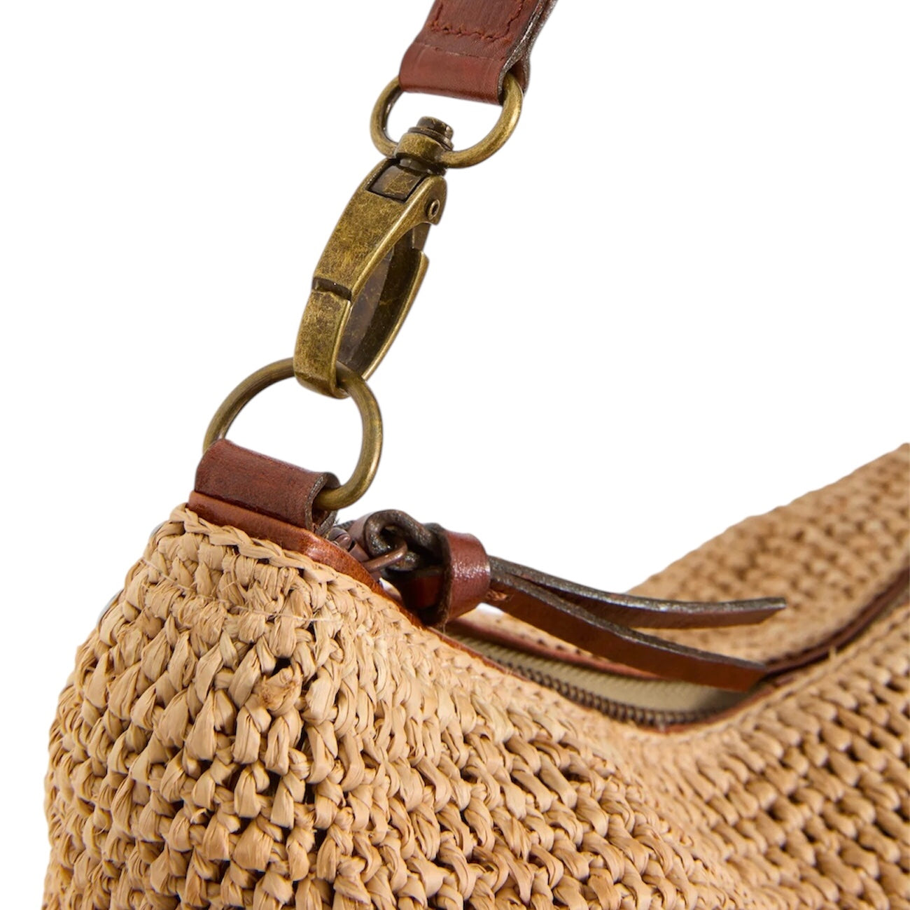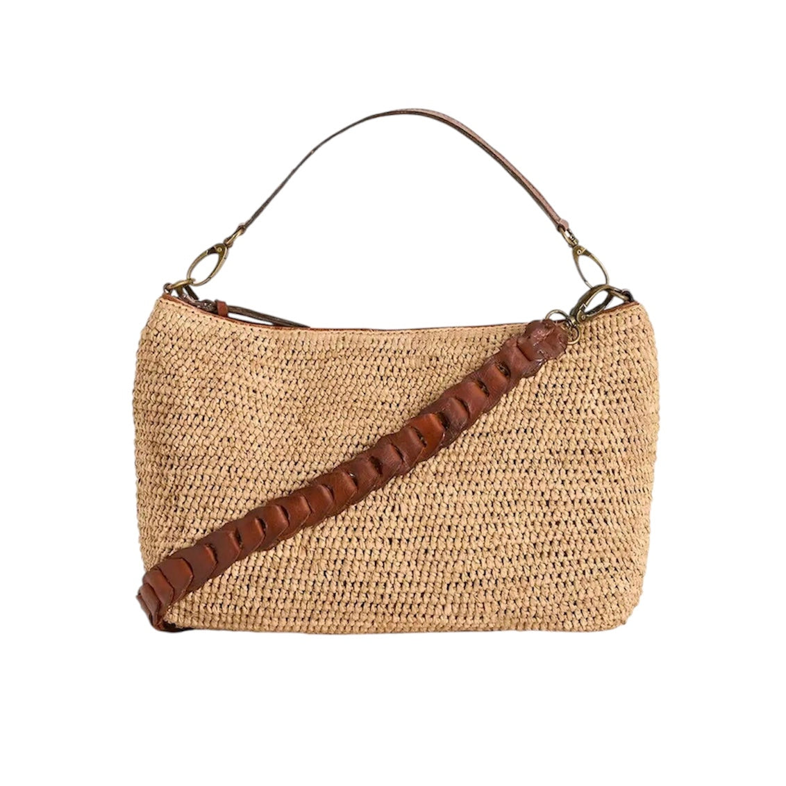 This stylish bag combines natural raffia with fine leather details for a refined, timeless look. It features a sturdy leather handle and a short braided leather strap, offering both elegance and versatility.