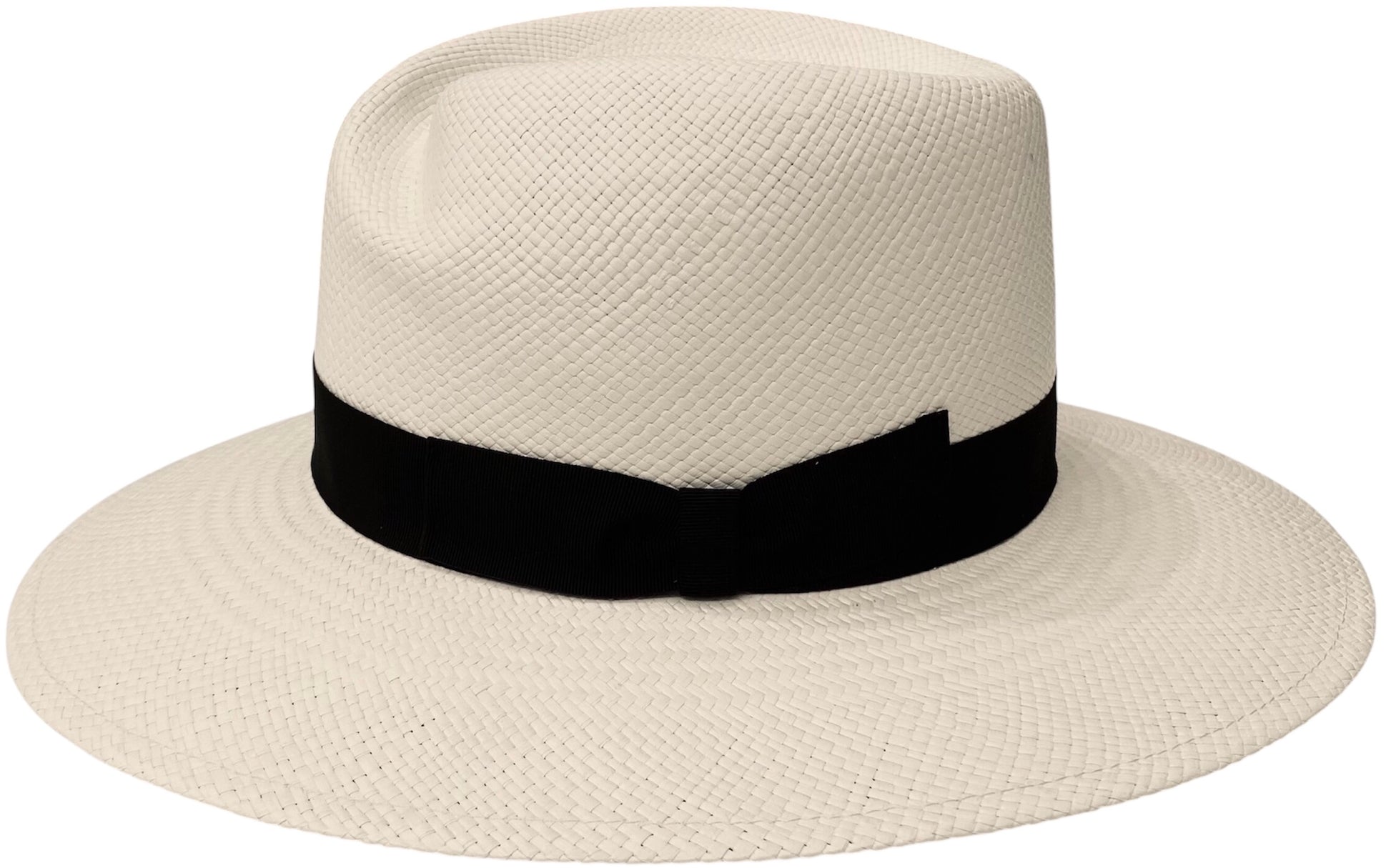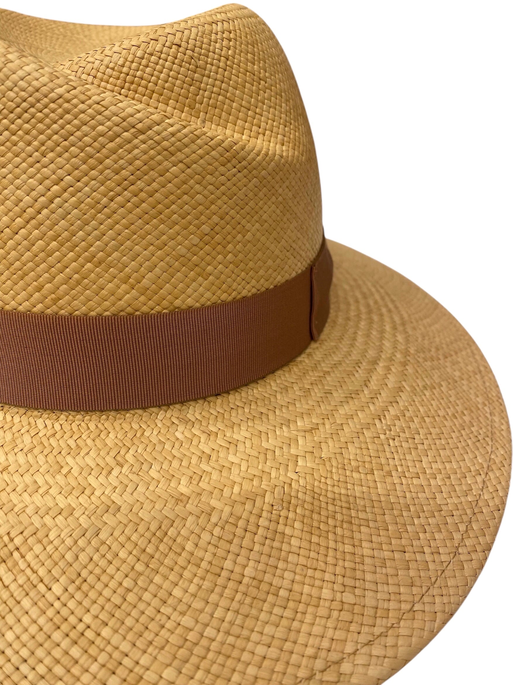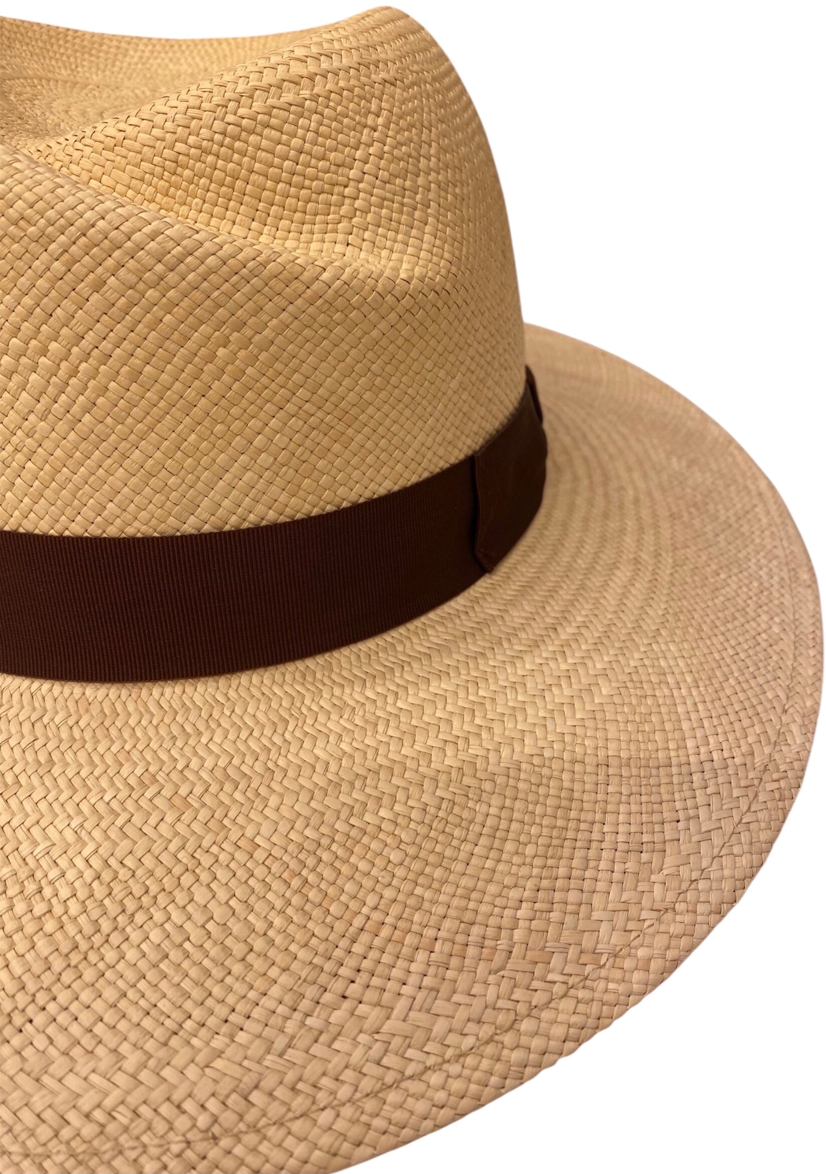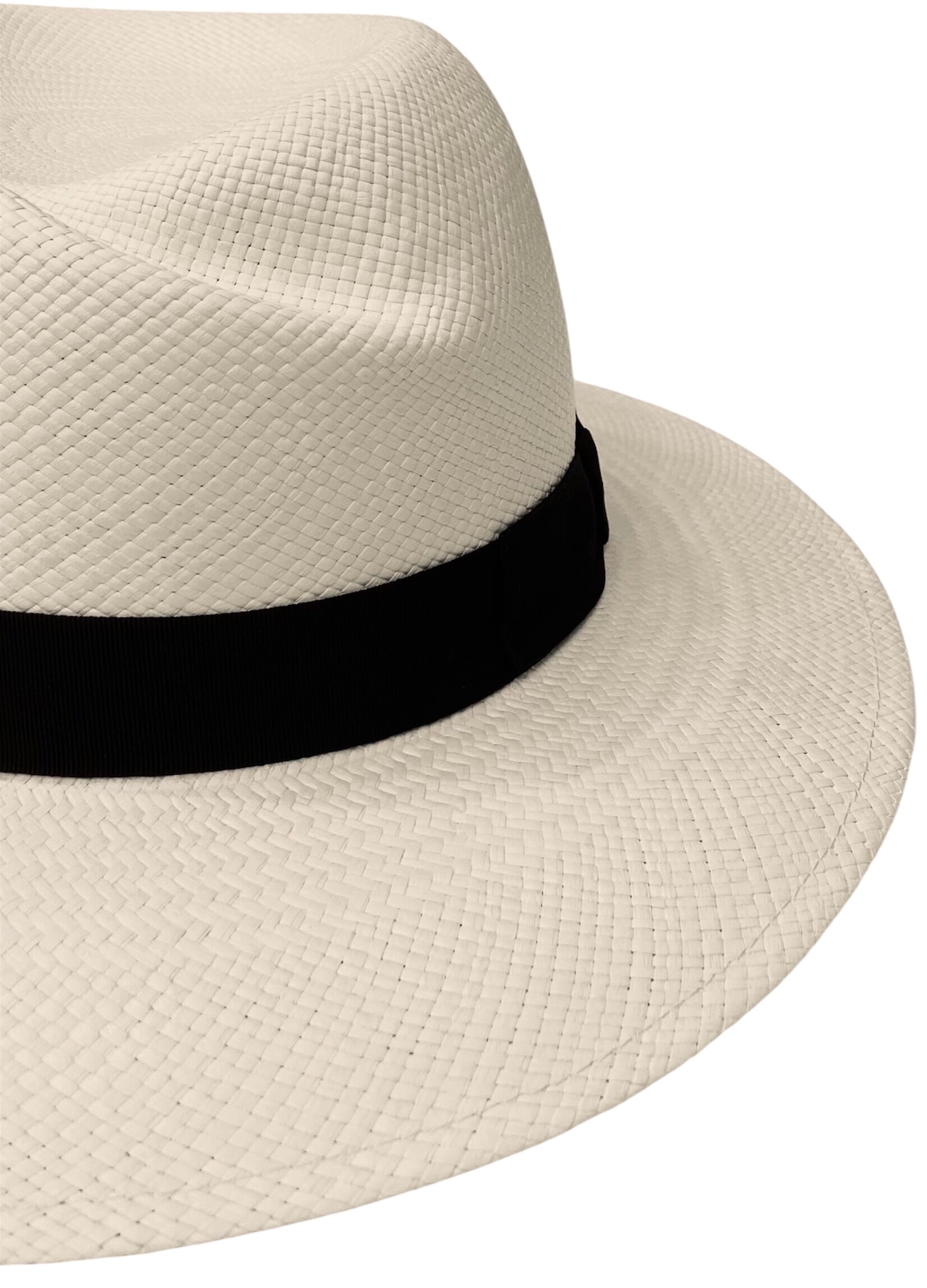 This elegant Panama hat features a tighter and more uniform weave, showcasing the craftsmanship behind its creation. Made from natural toquilla straw, it offers a sophisticated silhouette perfect for warm climates and special events.